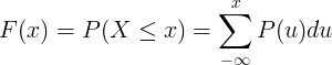 Kumulatiivinen jakautumisfunktio F (x) lasketaan diskreetin satunnaismuuttujan X todennäköisyysmassafunktion P (u) summaamalla.