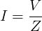Prúd záťaže I v ampéroch (A) sa rovná napätiu záťaže V Z = V vo voltoch (V) vydelenému impedanciou Z v ohmoch (Ω):